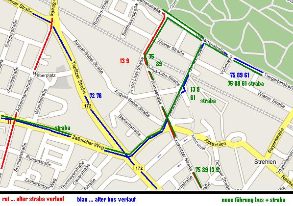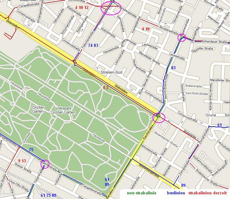 buslinien 89,61 und 83 könnten dadurch schon entlastet werden oder gar ganz wegfallen, wenn ein strabe über tiergartenstr. bis haltestelle karcherallee oder bis haltestelle mosenstraße/spenertstraße eingebaut wird